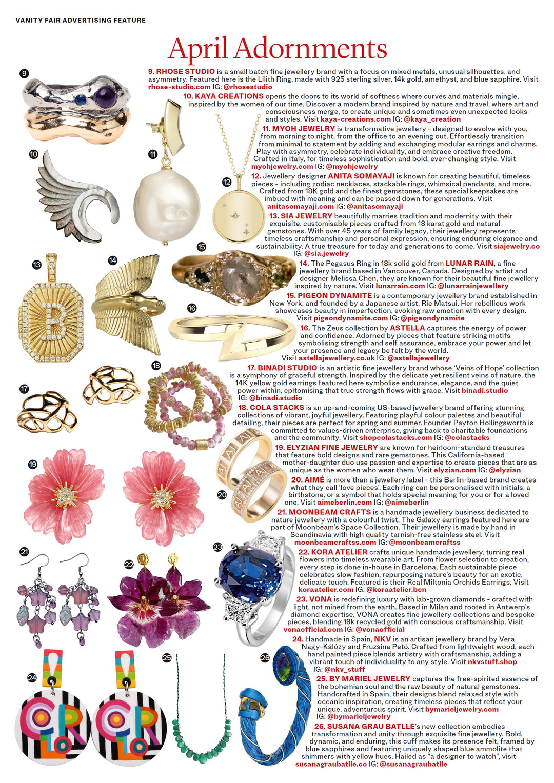 We are beyond honored to see our work featured in the April 2025 pages of Vanity Fair UK, a true arbiter of elegance and style. Their editors were captivated by the intricate, lifelike detail of our floral earrings, a piece that celebrates the romance of a blooming garden.