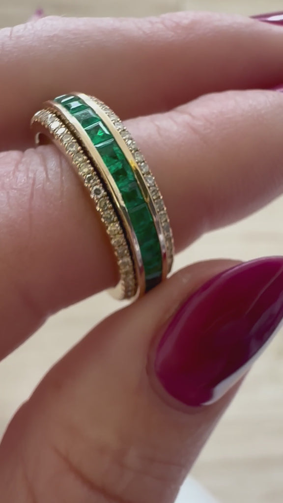 14K Gold Spinning Fidget Ring with Emeralds and Diamonds