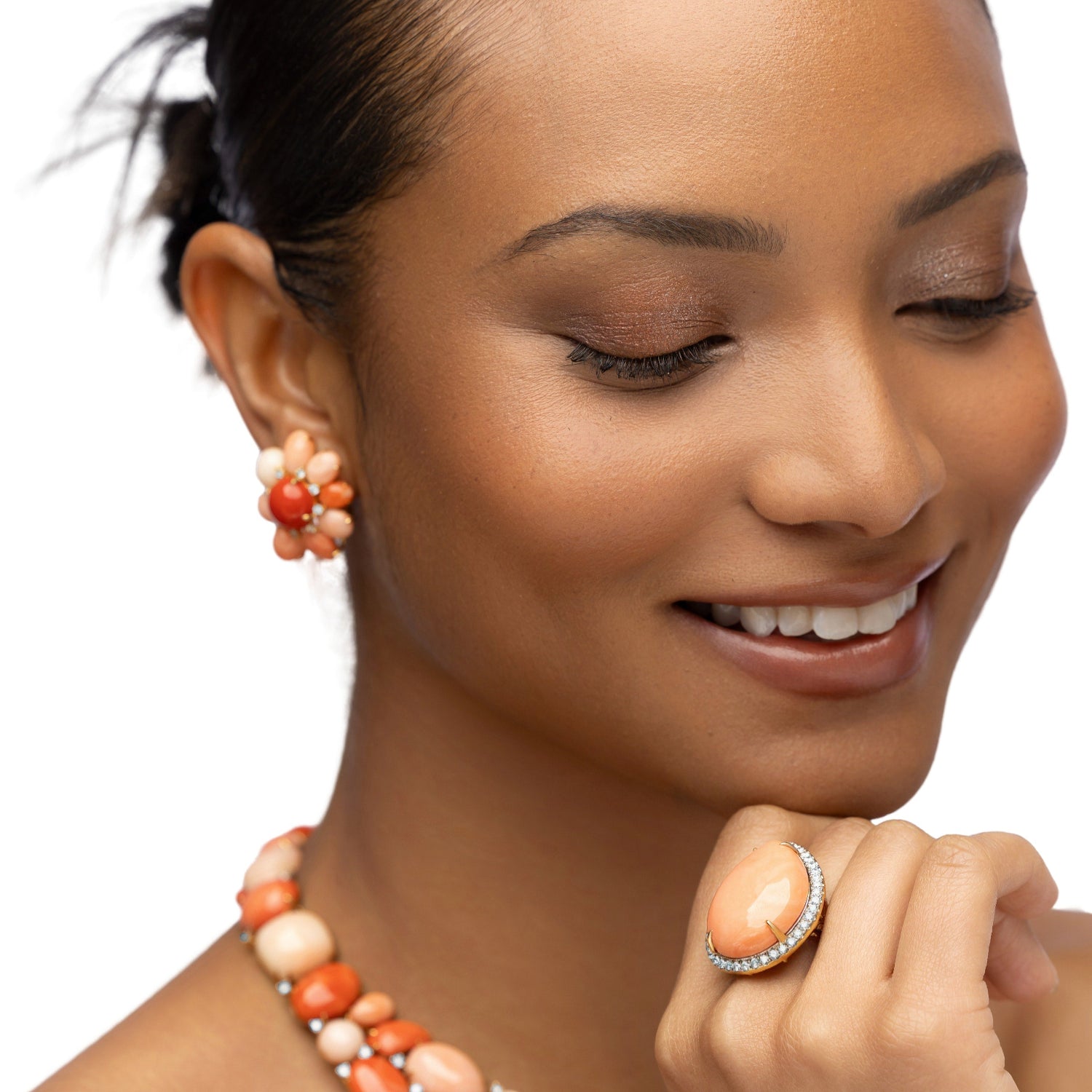 These exquisite convertible coral earrings offer two stunning looks in one—wear them as refined studs or attach the elegant drops for a bold statement. Inspired by nature, these floral earrings are meticulously crafted in 18K yellow gold and feature radiant coral and dazzling diamonds for a timeless, sophisticated allure.