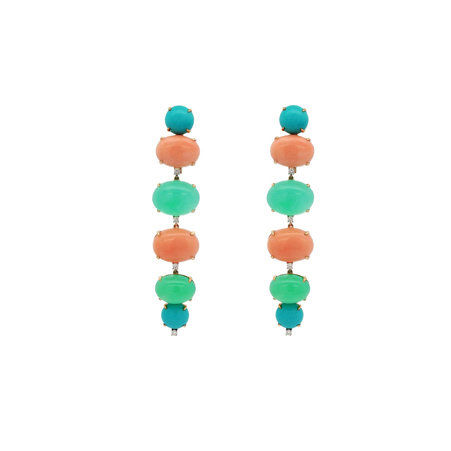 A symphony of color and form, the Coral, Chrysoprase & Turquoise Earrings marry sculptural elegance with bold modernity. Smooth cabochons of fiery coral, luminous chrysoprase, and tranquil turquoise are artfully stacked and accented with brilliant white diamonds. Handcrafted in rich 18K yellow gold, these earrings are a celebration of vibrancy and refinement.