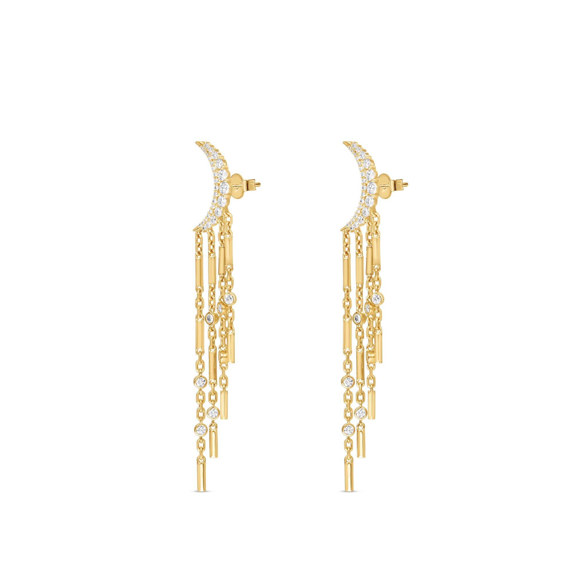 Glow with cosmic allure—these moon-inspired dangle earrings shimmer with diamond brilliance, artfully set in sculptural 14K yellow gold. Each gracefully curved moon design is crafted to catch the light and elevate everyday style with editorial sophistication.