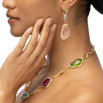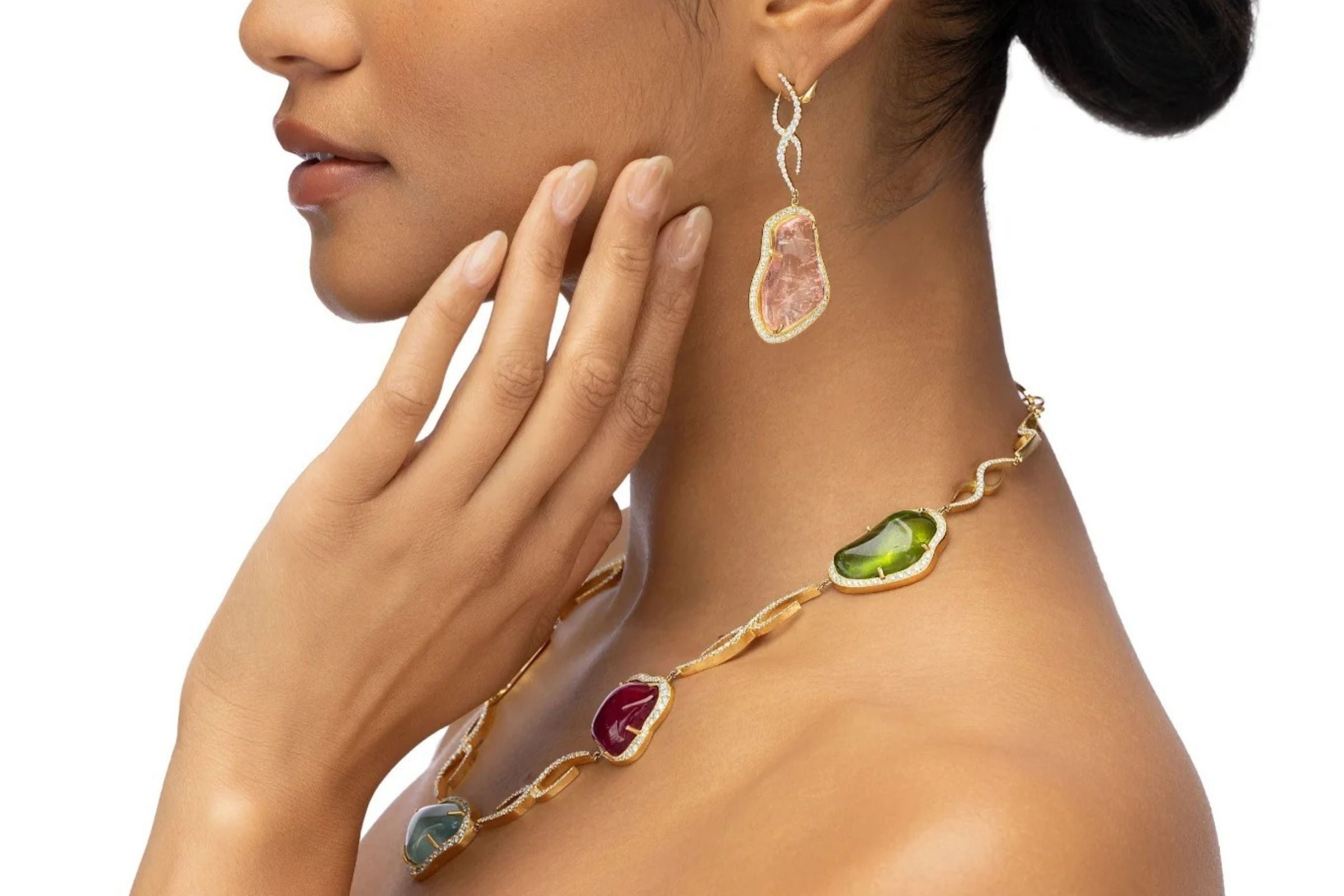 The Chroma Forme Necklace is a one-of-a-kind creation that celebrates the art of color in motion. Bold, freeform cabochons of aquamarine, heliodor, pink tourmaline, and peridot radiate in sculptural harmony — each framed by a halo of D-color, VVS1 diamonds that echo the fluid, diamond-set links connecting the design.