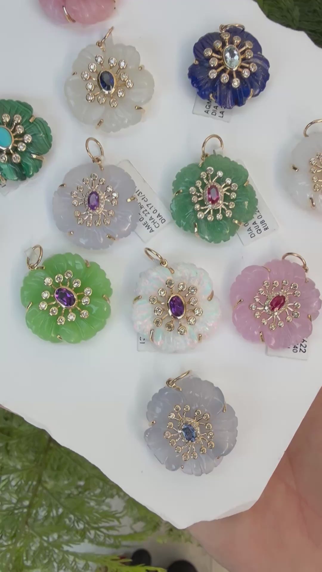 A vivid, hand-carved malachite blossom unfurls around a turquoise cabochon, crowned with a halo of bezel-set diamonds. Earthy, elegant, and impossible to forget.