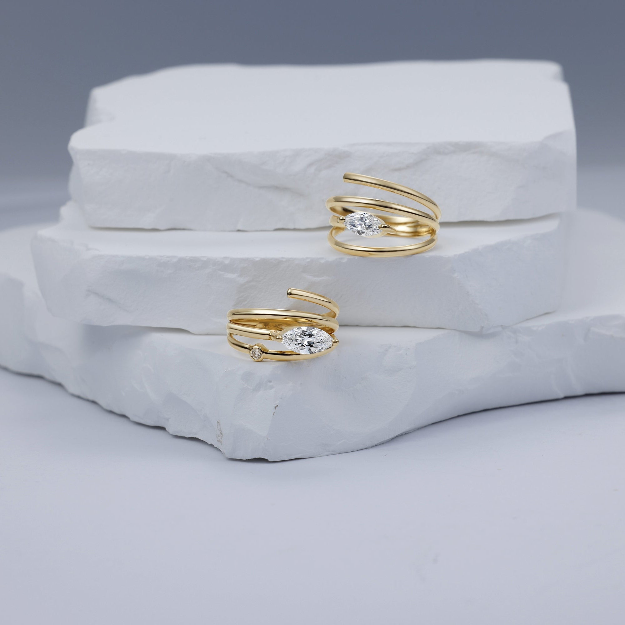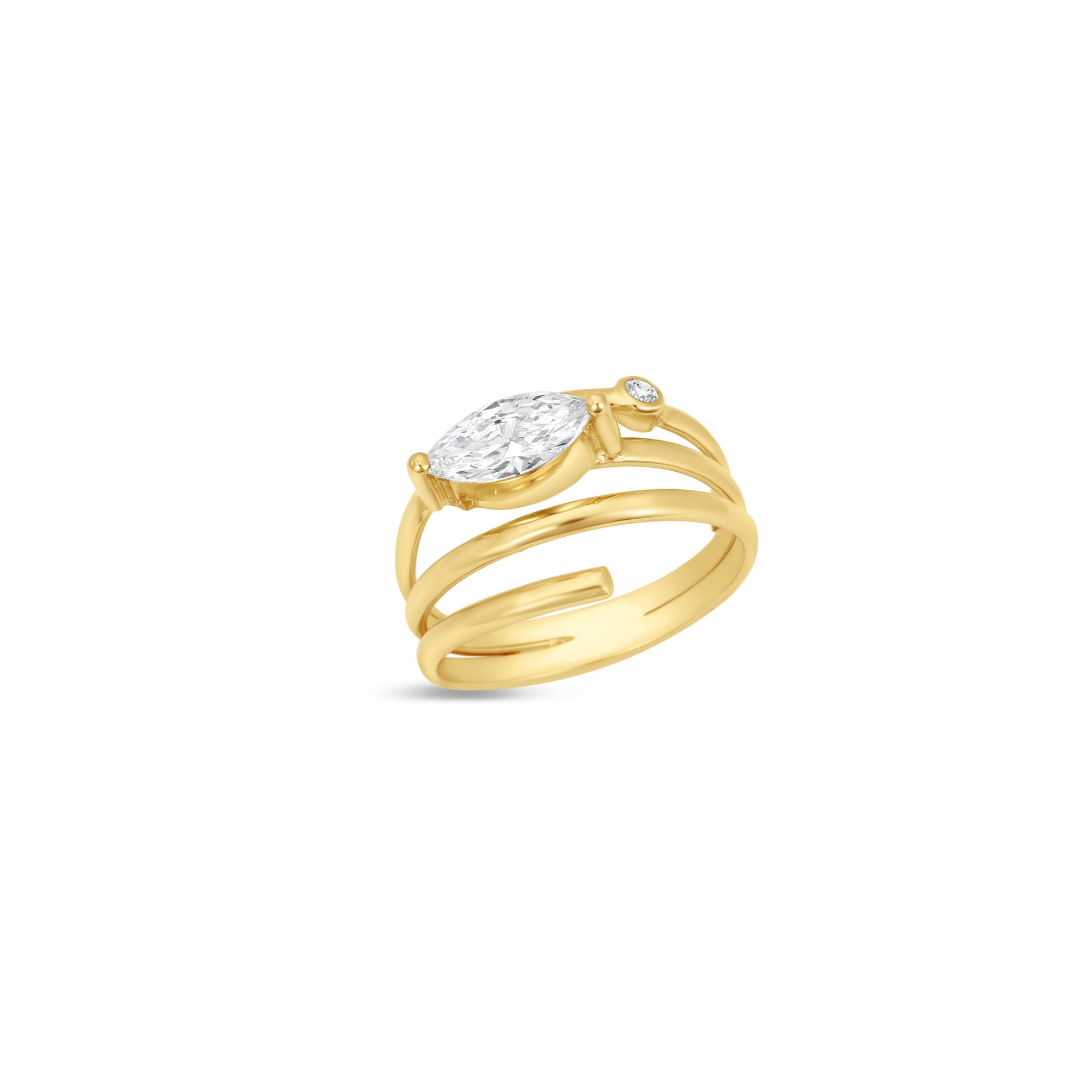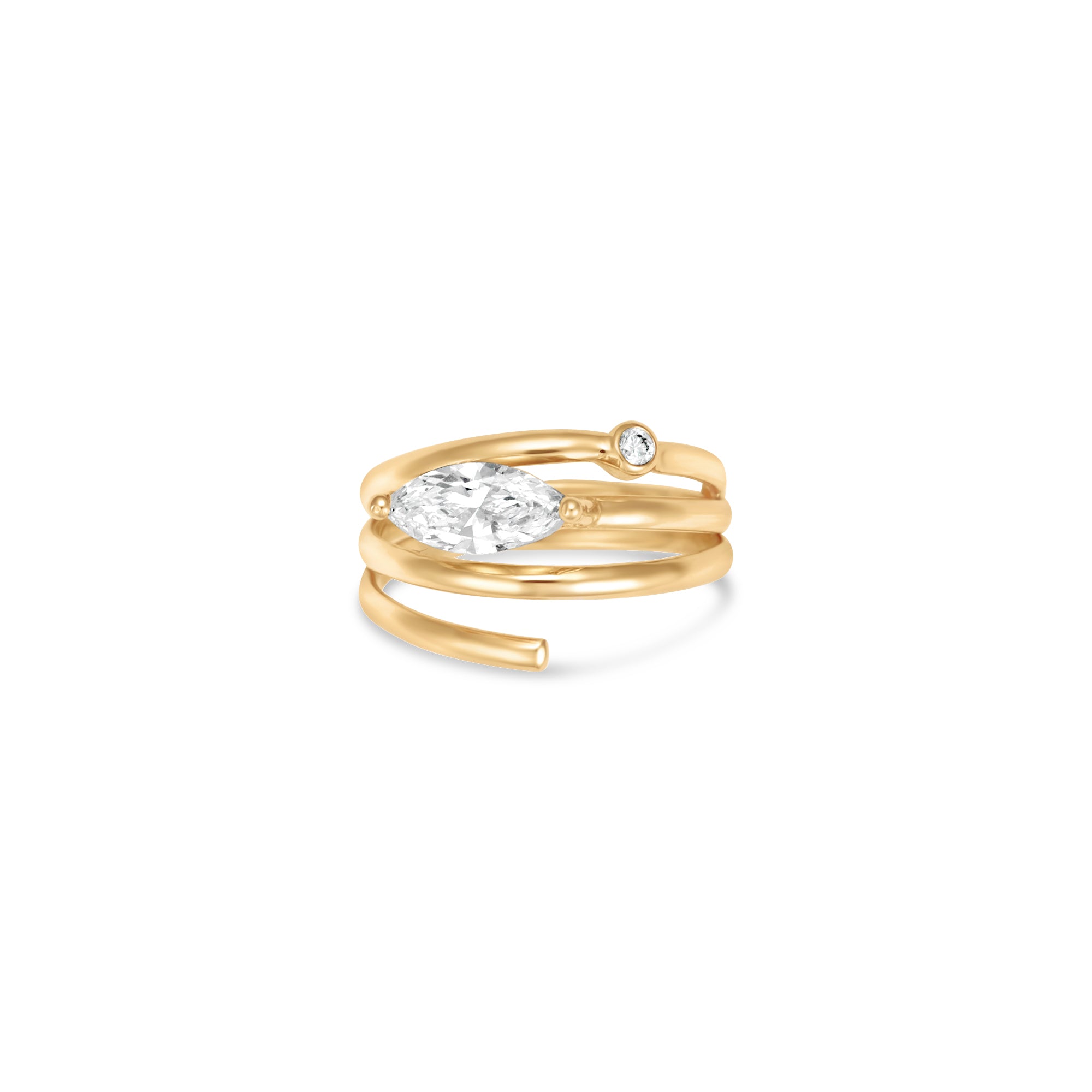 Elegant 14K yellow gold spiral ring featuring a sleek marquise-cut diamond, blending timeless luxury with modern minimalism, perfect for stacking or wearing alone. Paired with the small marquise ring.