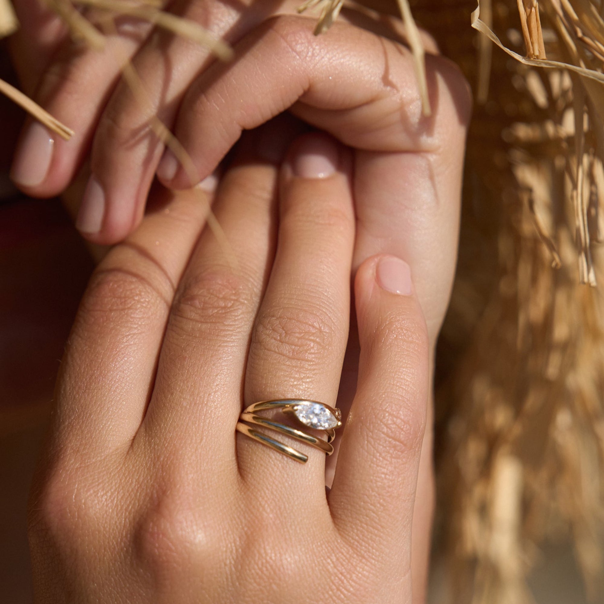 Elegant 14K yellow gold spiral ring featuring a sleek marquise-cut diamond, blending timeless luxury with modern minimalism, perfect for stacking or wearing alone. On model, right ring finger.