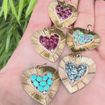 A playful heart framed by light. The Radiant Heart Charm is set in 14k yellow gold, featuring a pavé diamond outline surrounding a vivid gemstone cluster, set against a finely fluted sunburst ground.