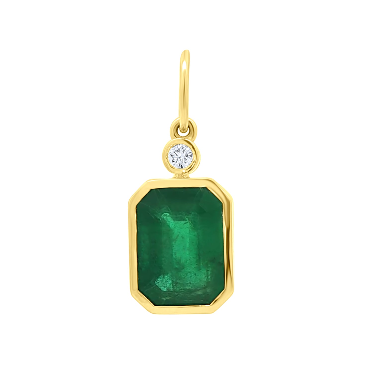A bold burst of emerald brilliance. This pendant features a striking 6.34ct Zambian emerald set in polished 14K yellow gold, its saturated green hue enhanced by a single natural diamond accent. Refined, elegant, and unmistakably luxurious—an effortless statement piece.